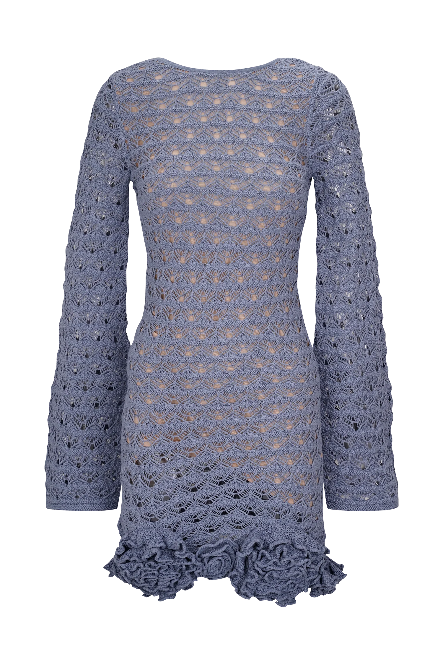 The AILEEN Ruffle Crochet Mini Dress captures coastal sophistication with a touch of playful romance. Crafted from a delicate crochet knit and lined with soft mesh for comfort, this mini dress features long sleeves and a striking deep V back neckline for sun-kissed drama. The flirty ruffle hemline adds a feminine finish, while the fitted silhouette is perfect for everything from lazy lunches to twilight dinners by the sea.
