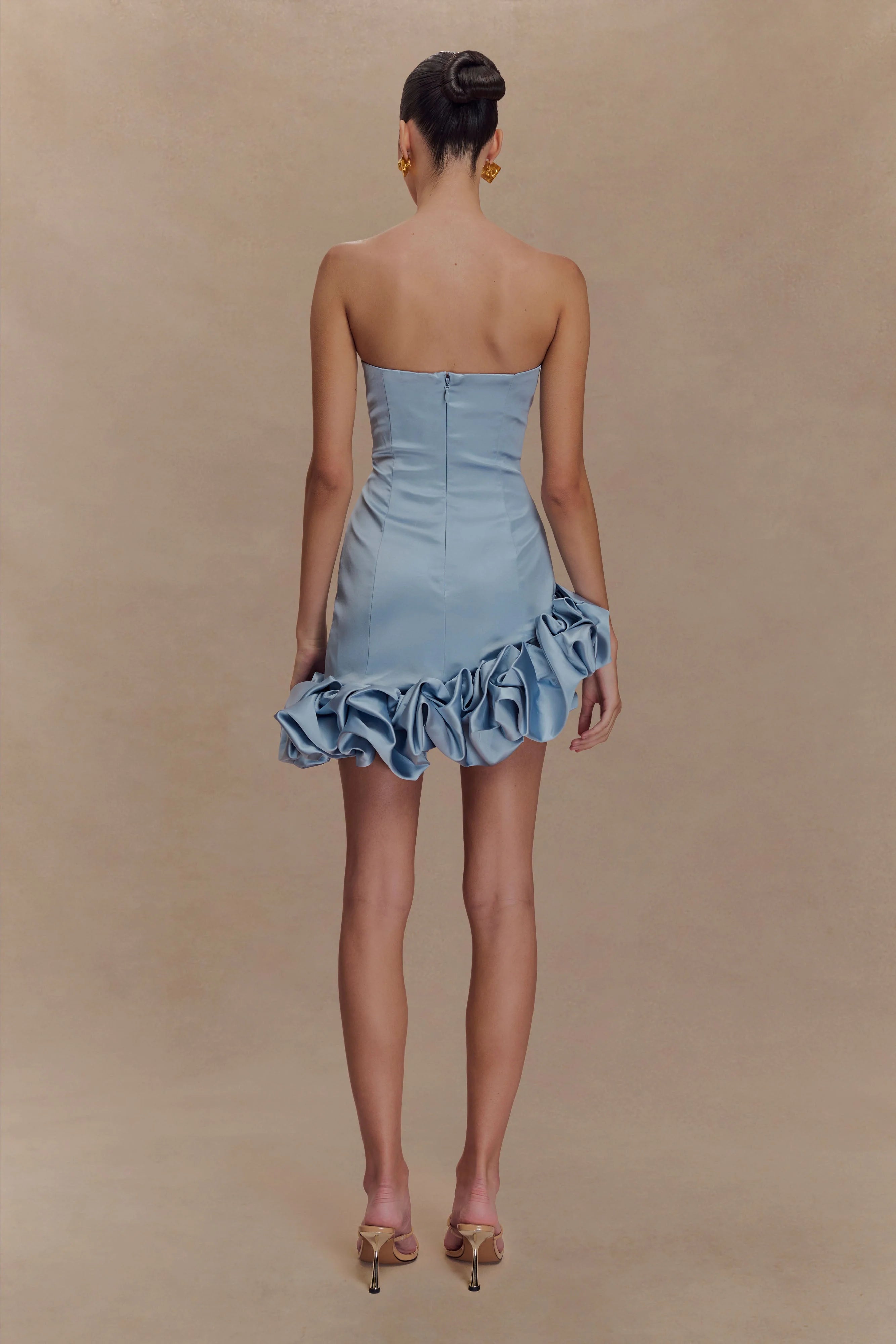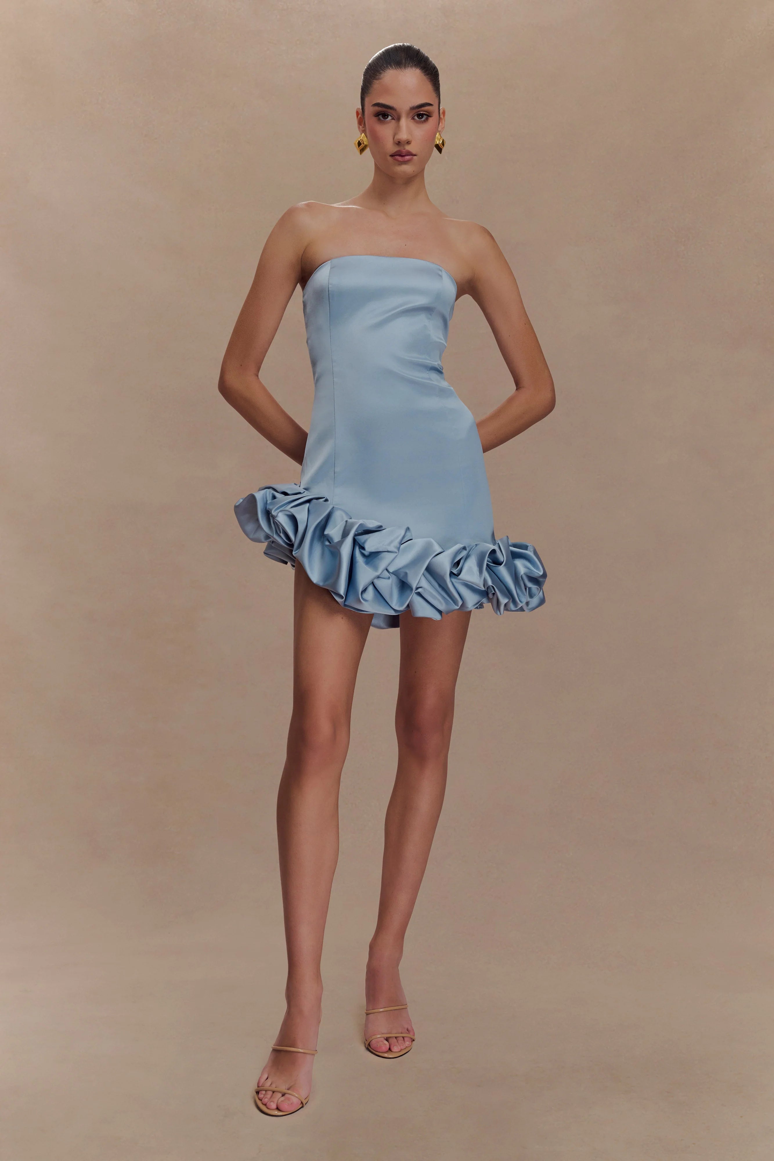 Make a statement in the ALBA Bubble Mini Dress, a captivating blend of elegance and playfulness. This strapless design features a fitted bodice that highlights your silhouette, while the asymmetrical bubble hem adds a modern edge. Delicate flower hem details bring a touch of whimsy, perfect for any occasion that calls for feminine flair. Finished with a centre-back zip for a seamless fit, this dress is your go-to for cocktail parties, special events, or evenings where you want to stand out with effortless charm.