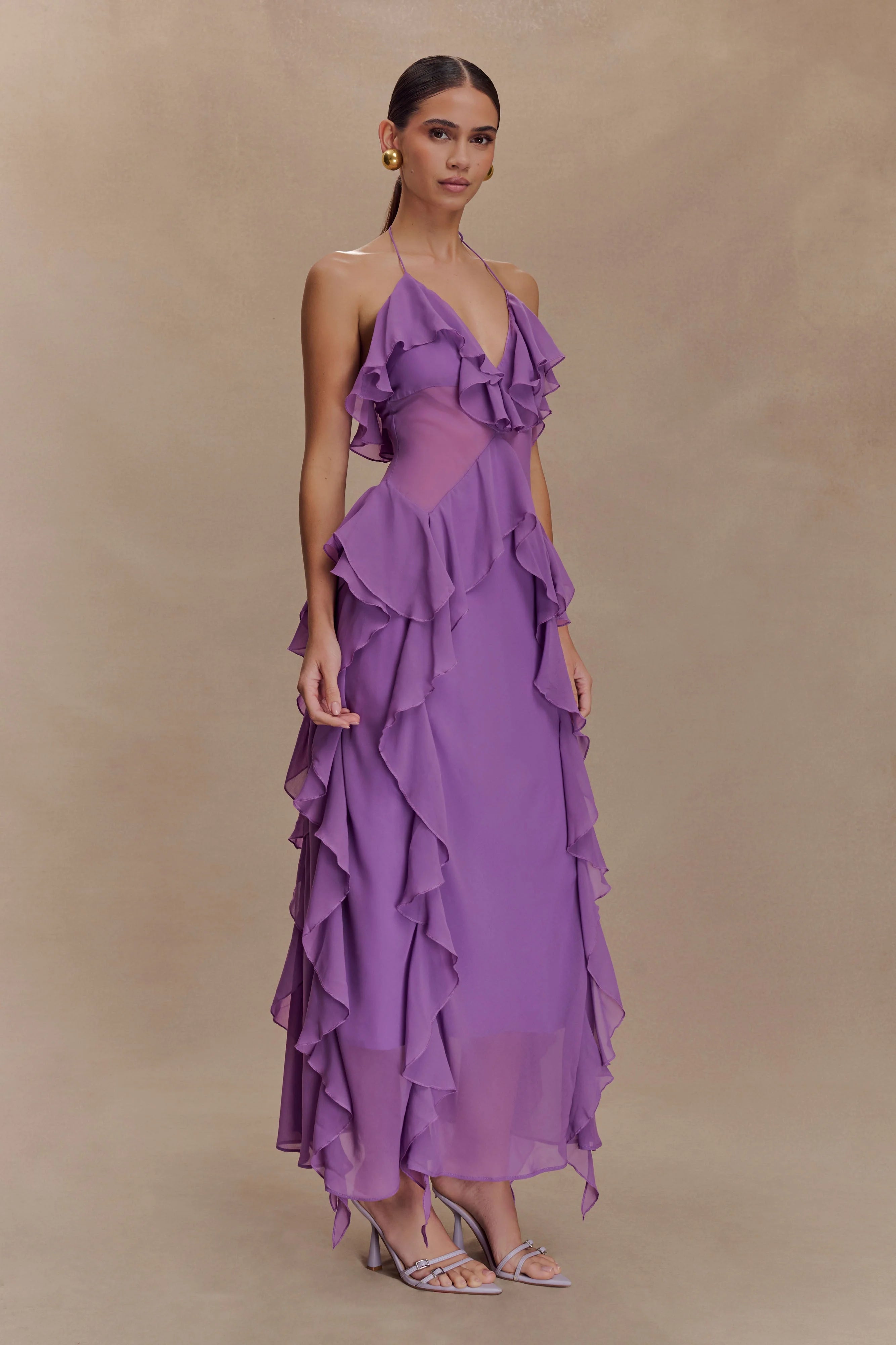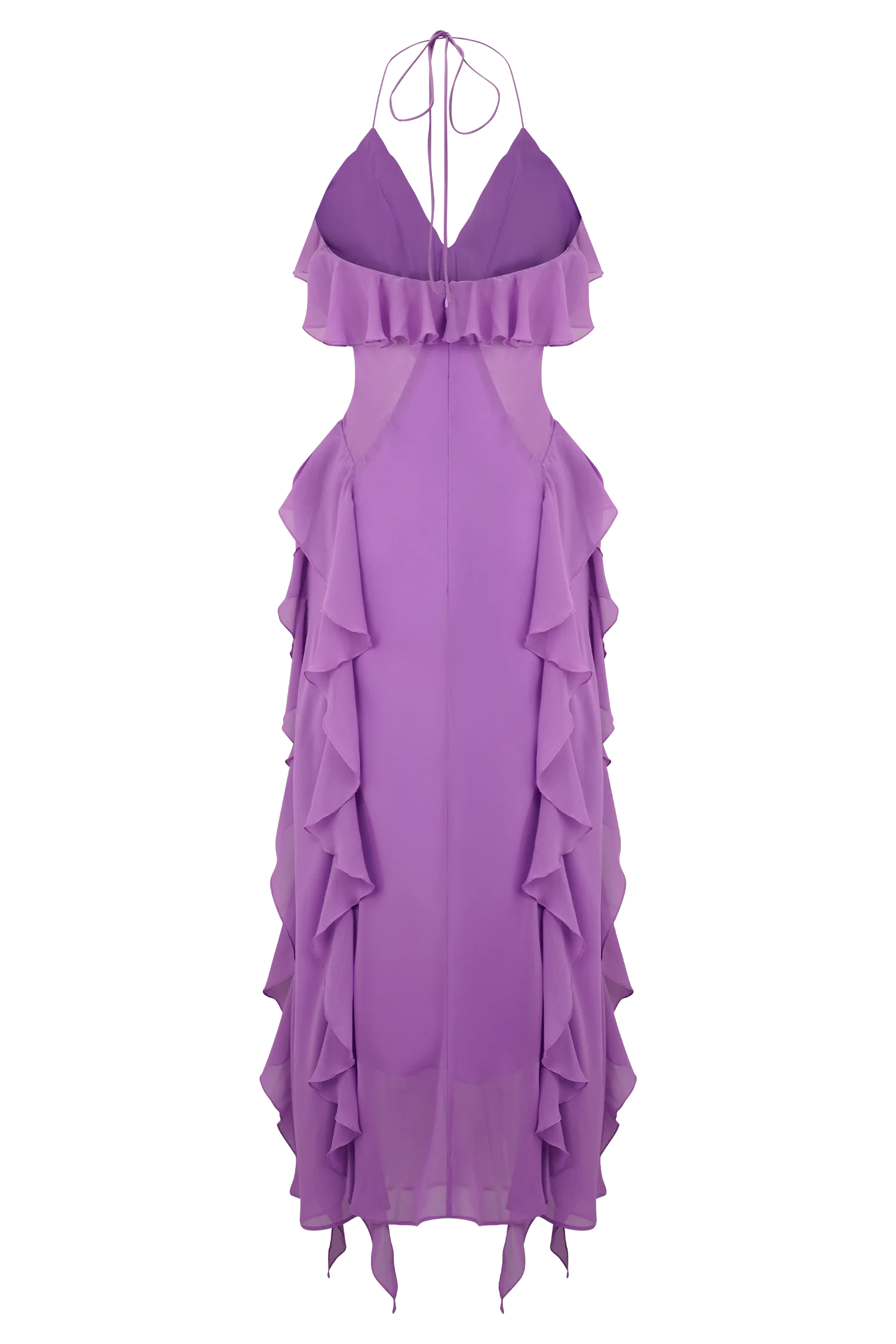 The ALEYNA Chiffon Ruffle Midi Dress is a dreamy blend of elegance and flirtation. Designed with a halter neck tie and V neckline, it skims the body in a relaxed bodycon silhouette that flatters without restriction. Sheer side panels add a soft hint of allure, while cascading ruffle details create movement and charm with every step. Partially lined for just the right amount of coverage, this dress is your go-to for romantic getaways, destination events, and moonlit dinners.