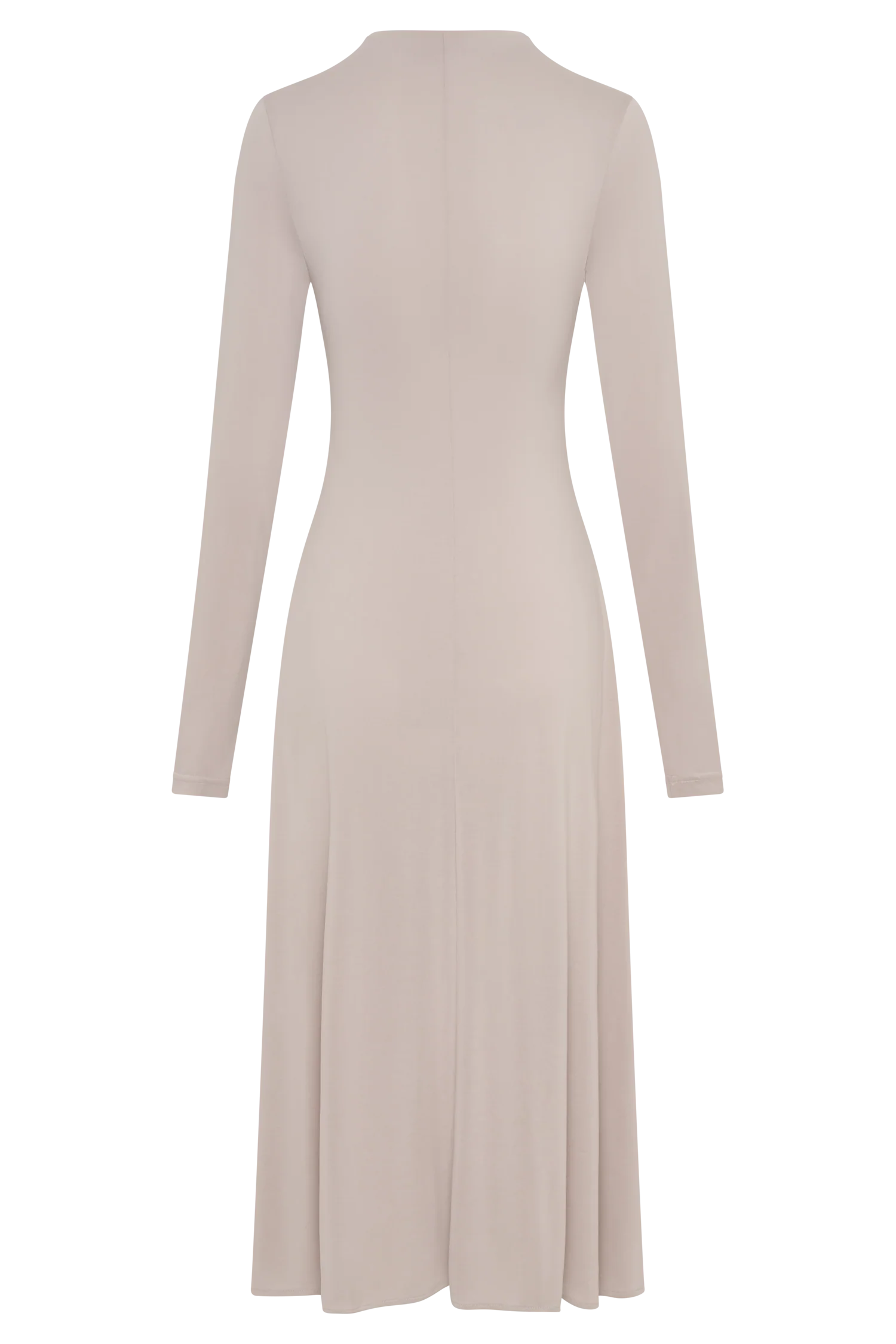 The ANDERS Peached Jersey Midi Dress combines comfort with sophistication. Featuring a grown-on neckline and long sleeves, this dress provides a sleek and fitted silhouette that flatters your figure. The maxi length and flared hem create an elegant flow, while the functional centre front button closure adds a classic touch. Crafted from soft peached jersey, the Anders Dress offers a cozy yet refined look, perfect for both casual and semi-formal occasions.