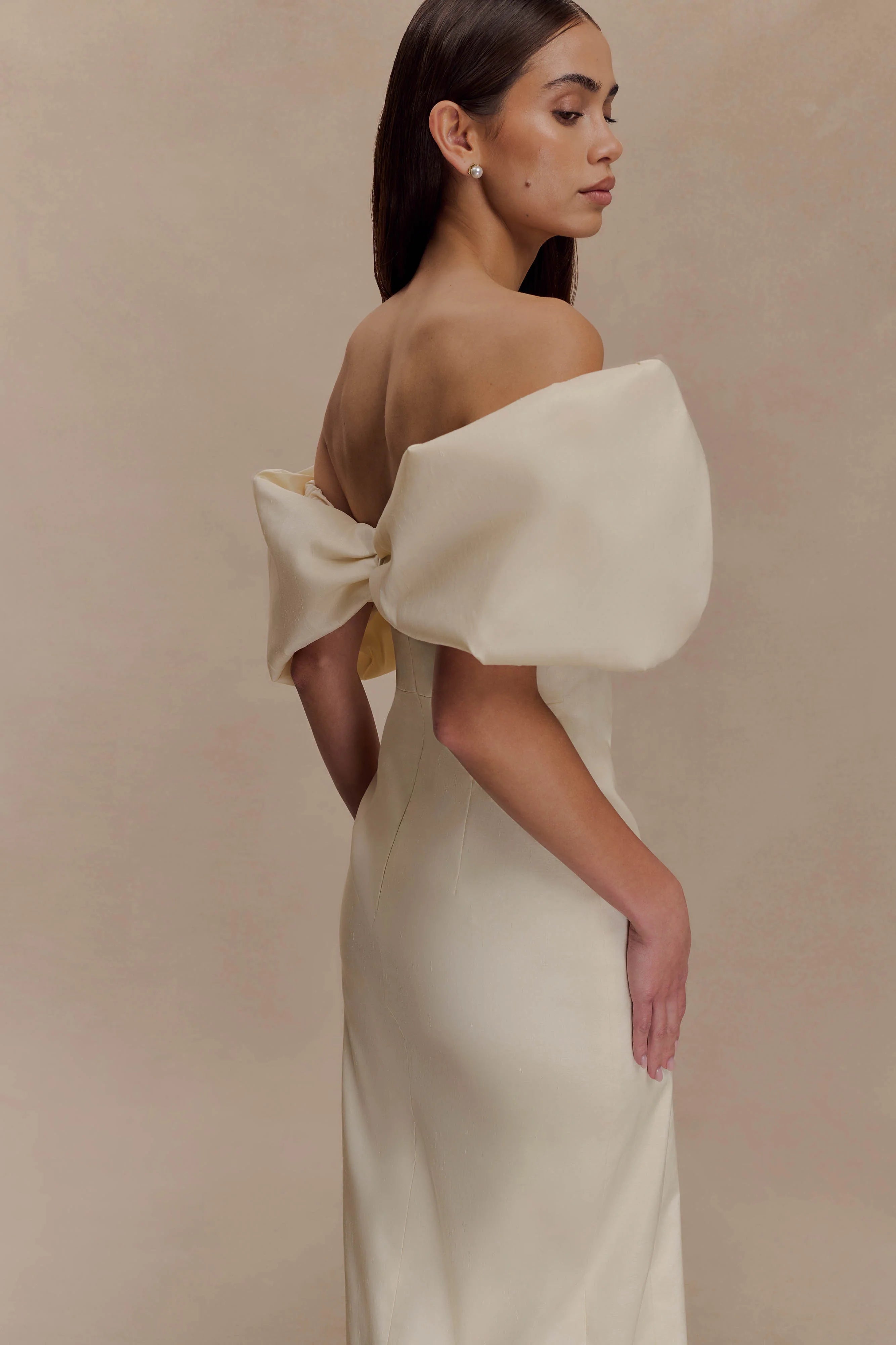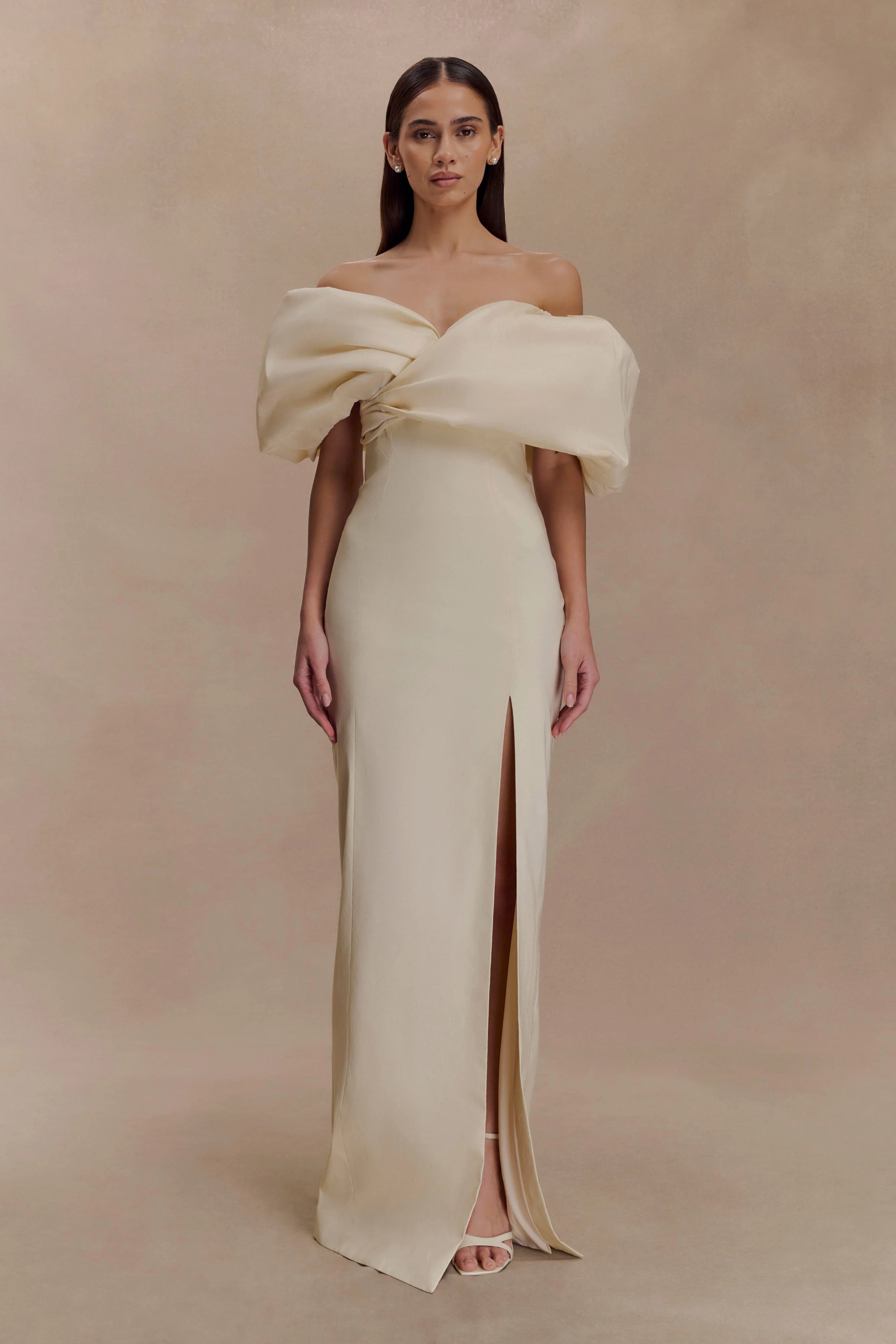 The ANGELICA Taffeta Off Shoulder Bridal Gown is a modern take on timeless romance. Designed with an off-the-shoulder neckline and a full, gathered bust, this gown flatters the décolletage while sculpting the silhouette through elegant front and back princess seams. The fitted shape flows into a maxi-length hem with a daring front leg split—balancing classic sophistication with contemporary allure. Finished with a hidden back zip and internal waist stay for secure wear, this gown is lined for comfort and made to move with grace down the aisle and beyond.