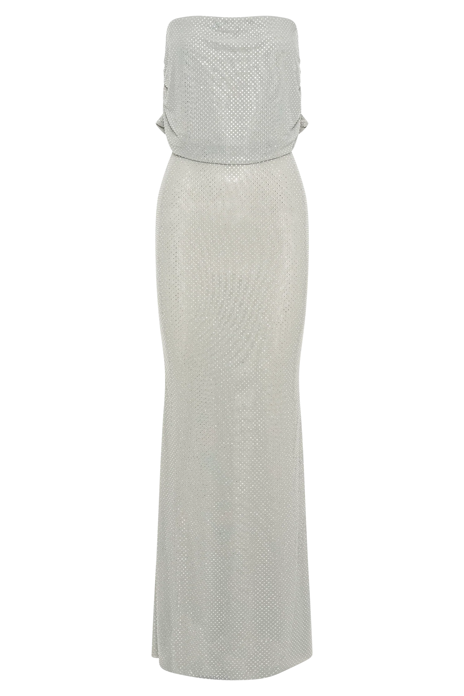The ARNA Off Shoulder Diamante Maxi Dress exudes elegance and glamour. This bodycon dress features an off-the-shoulder design and a stunning fishtail hem, creating a dramatic silhouette. The gathered bust overlay adds a touch of sophistication, while the open back with back hardware provides a striking detail. With its maxi length, the Arna dress is perfect for making a statement at any special event.