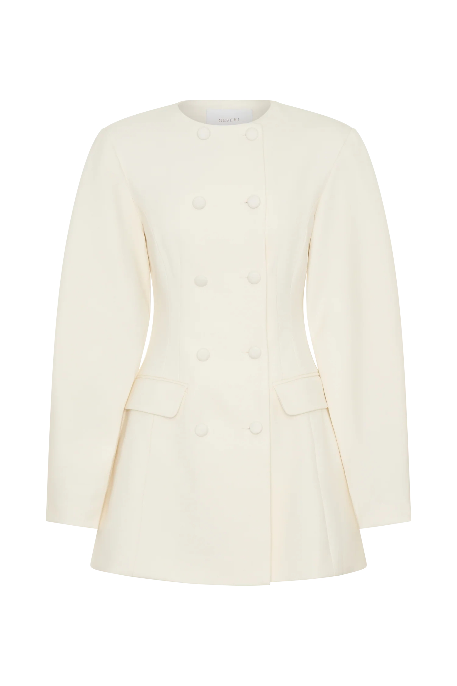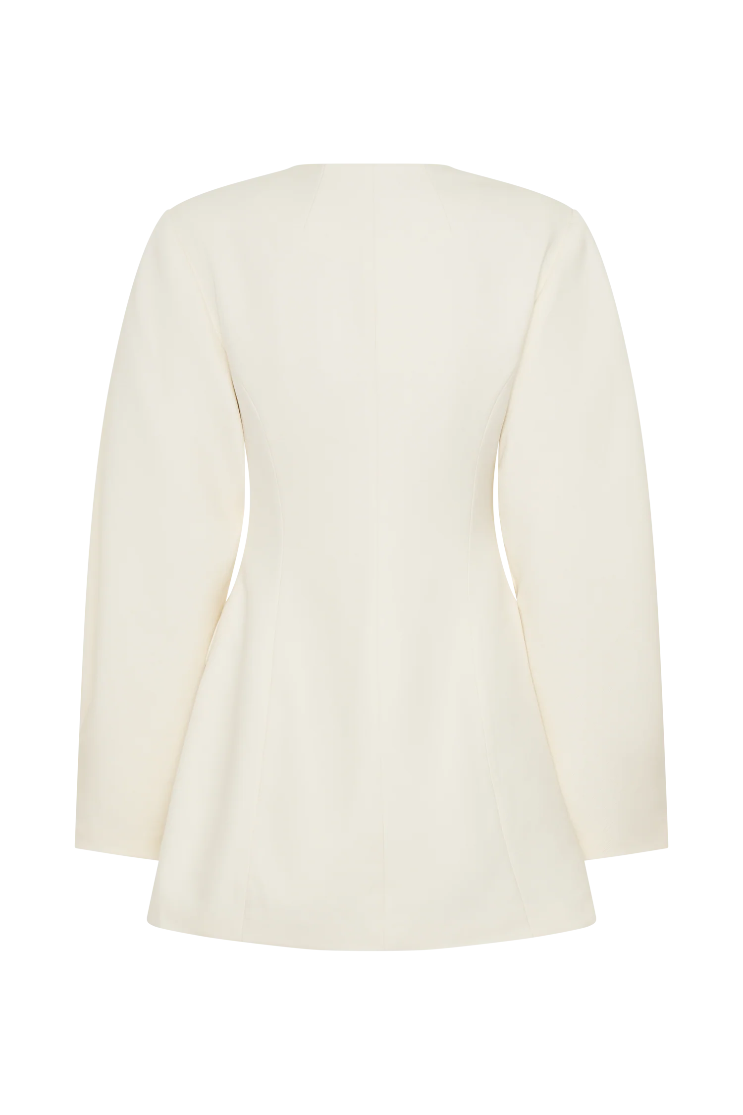 The BEATRICE Blazer Mini Dress is a statement silhouette with refined details. Designed with long balloon sleeves and a high neckline, it balances sharp tailoring with soft volume. Non-functional pocket flaps add structure, while the back belt with a custom buckle cinches the waist for a flattering fit. Shoulder pads enhance the tailored shape, and a double button front closure finishes the look. Fully lined and cut to a mini length, this dress is designed for modern sophistication with a bold edge.