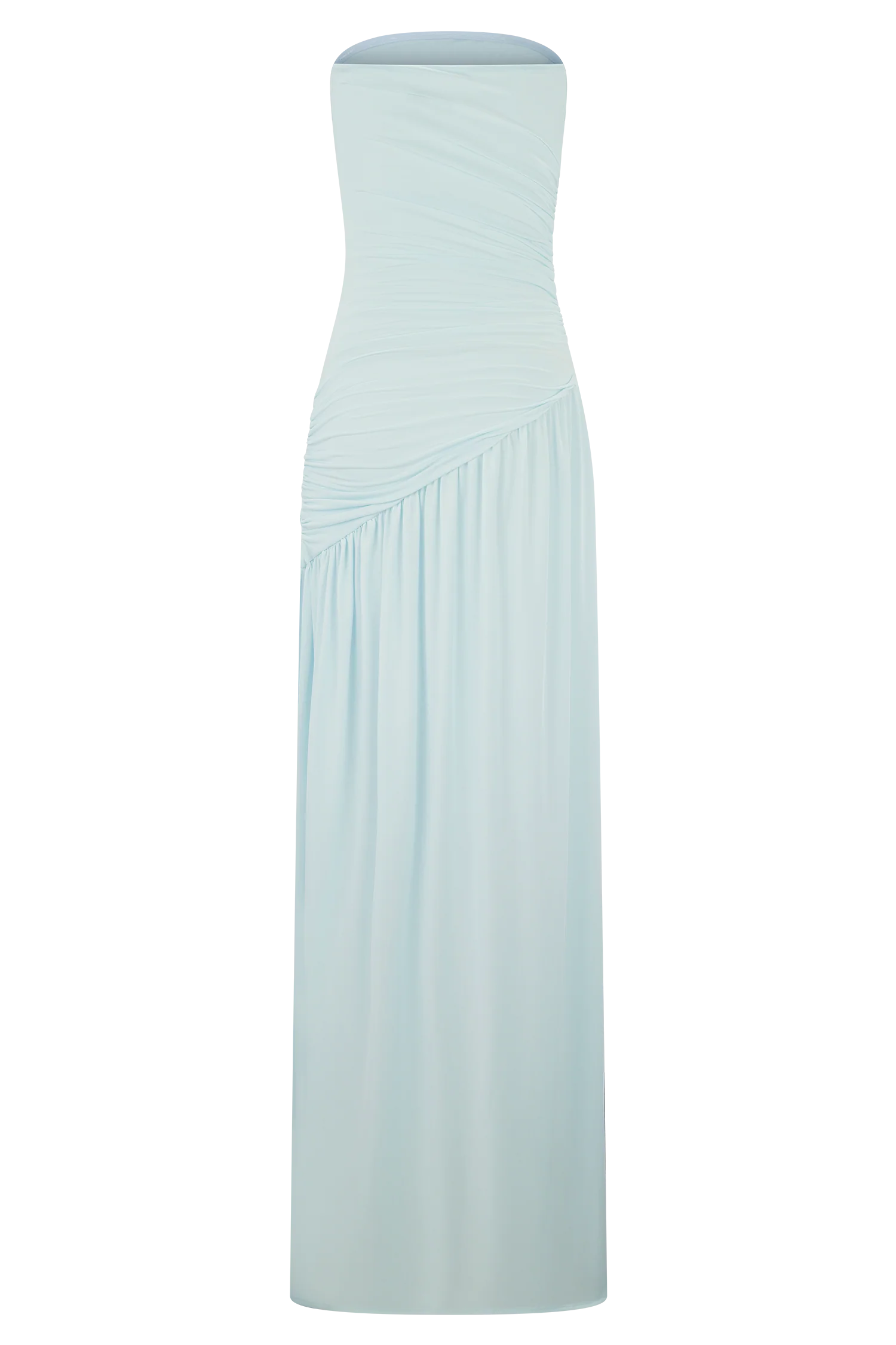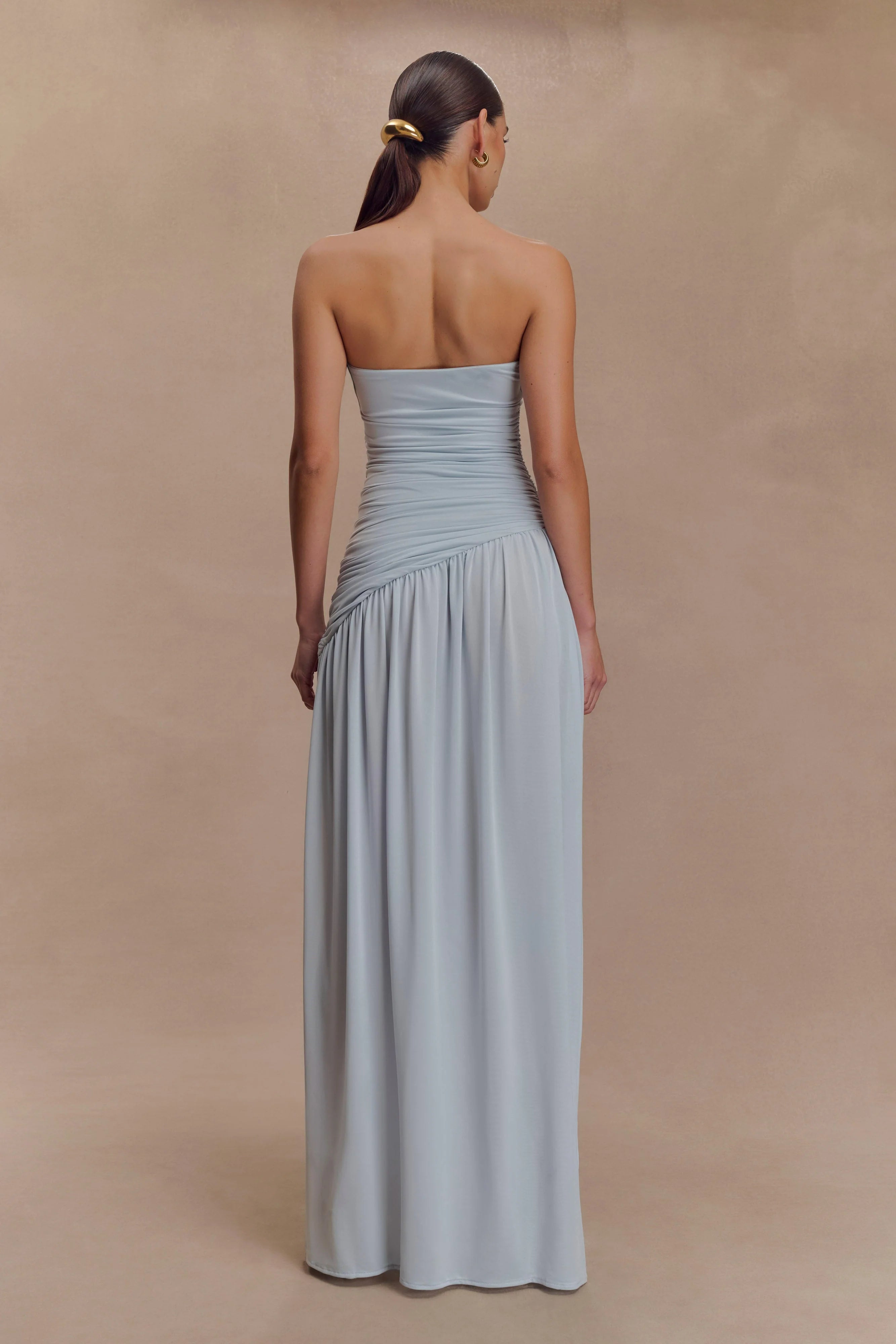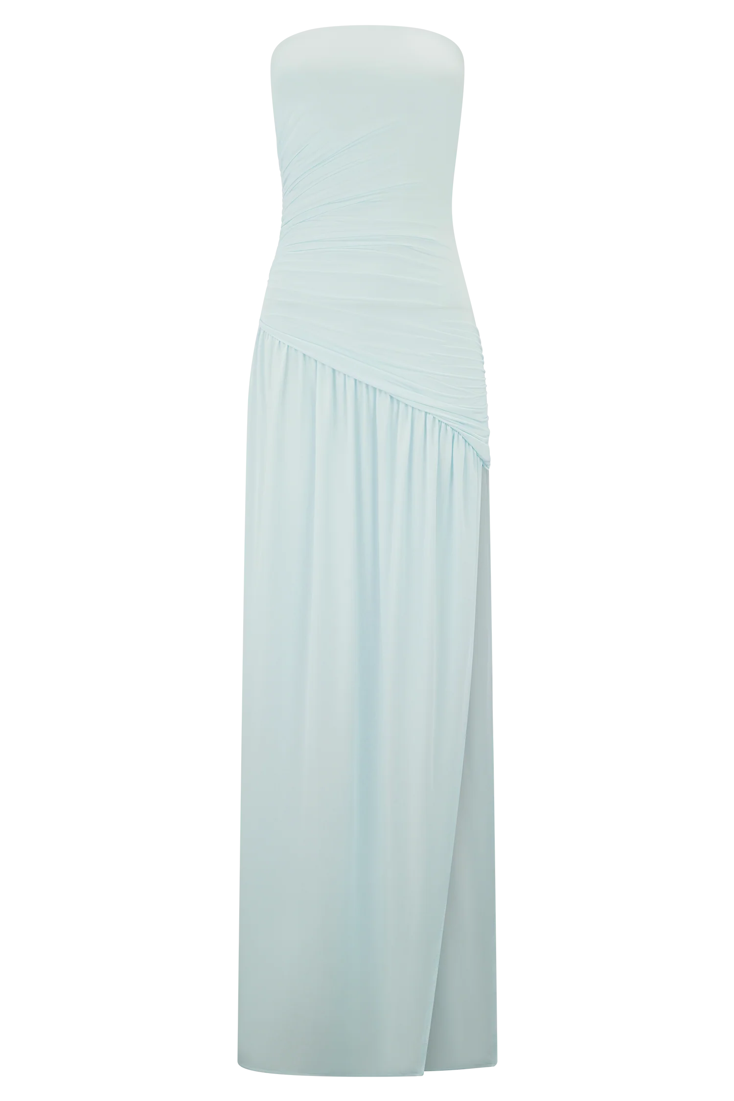 The BEX is a strapless maxi dress with a low, straight-cut neckline and a ruched bodice. It also features an asymmetrical waist detail that beautifully contrasts the flow of the full, gathered skirt. A side seam split along the dress adds contemporary texture to the dress' otherwise classic, feminine silhouette. Its soft, stretchable fabric allows for a comfortable bodycon fit without sacrificing the elegant form.