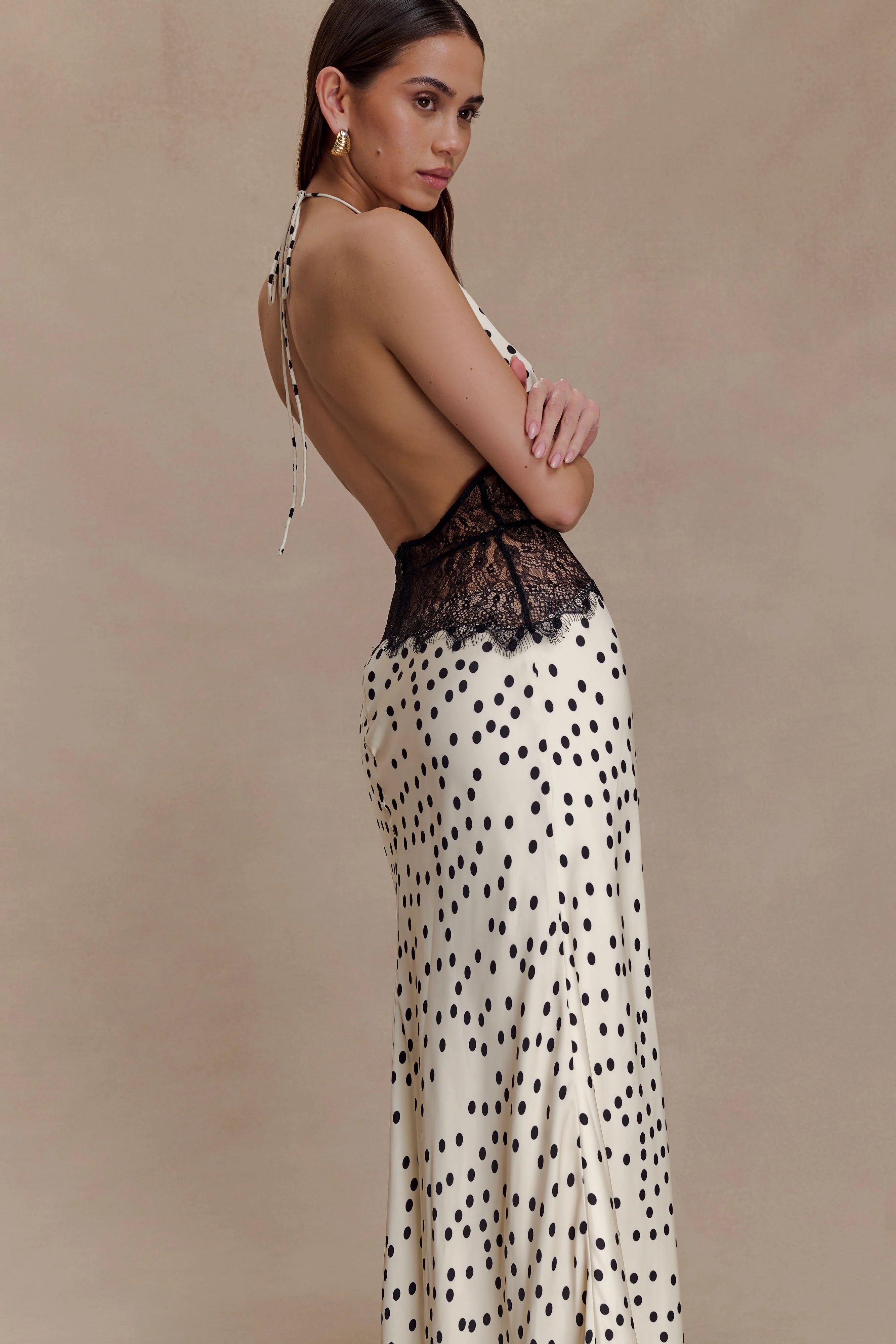 Turn heads in the DINAH Lace and Satin Maxi Dress, a romantic silhouette that blends soft textures with sultry details. Featuring a halter tie V neckline and softly gathered bust, this dress flows into a sheer lace body that skims the figure with ease. The low back adds a touch of drama, while the maxi length and invisible zip create a seamless finish. Partially lined for subtle coverage, this dress is the epitome of slip-on elegance with an irresistible edge.