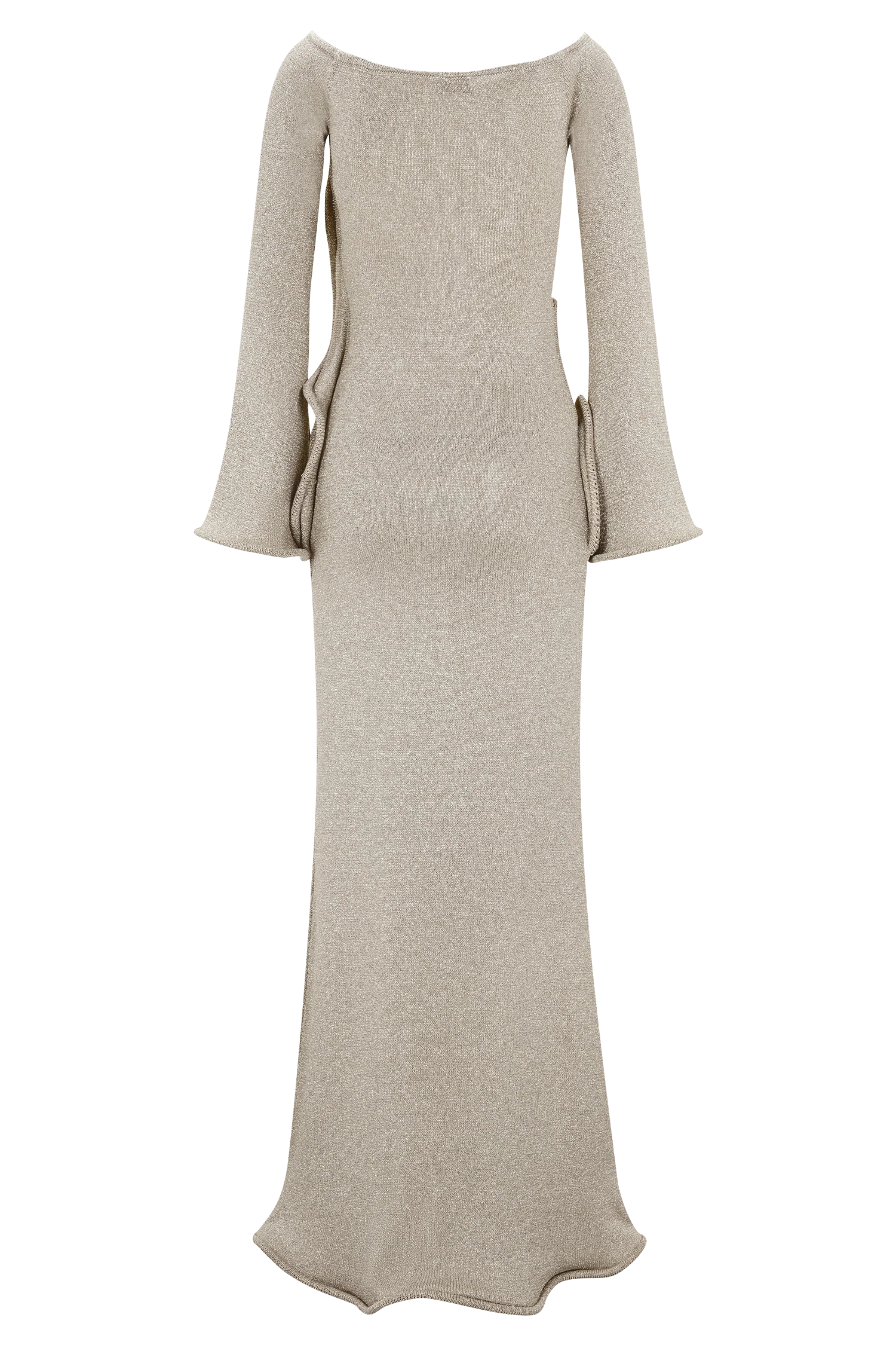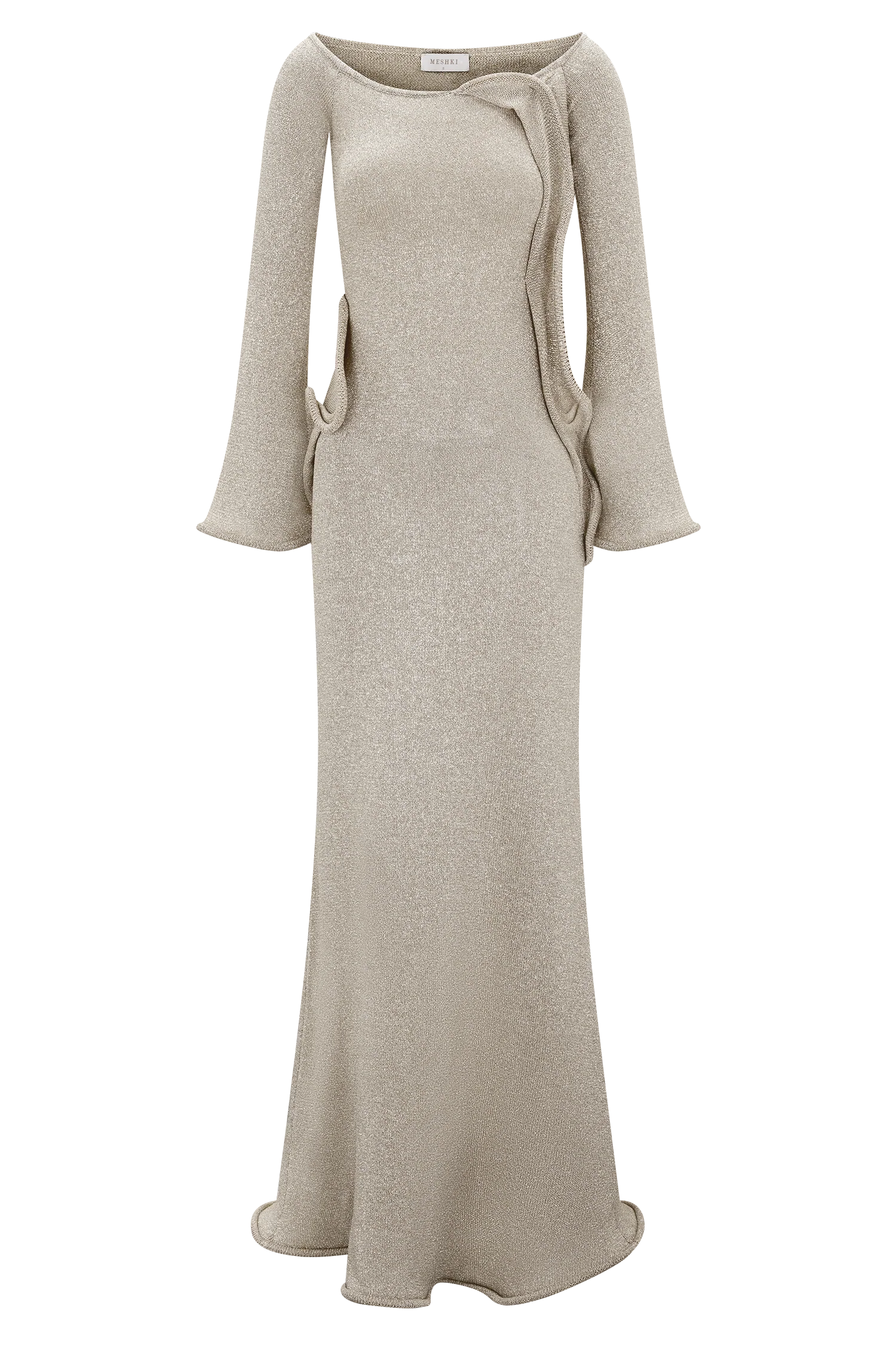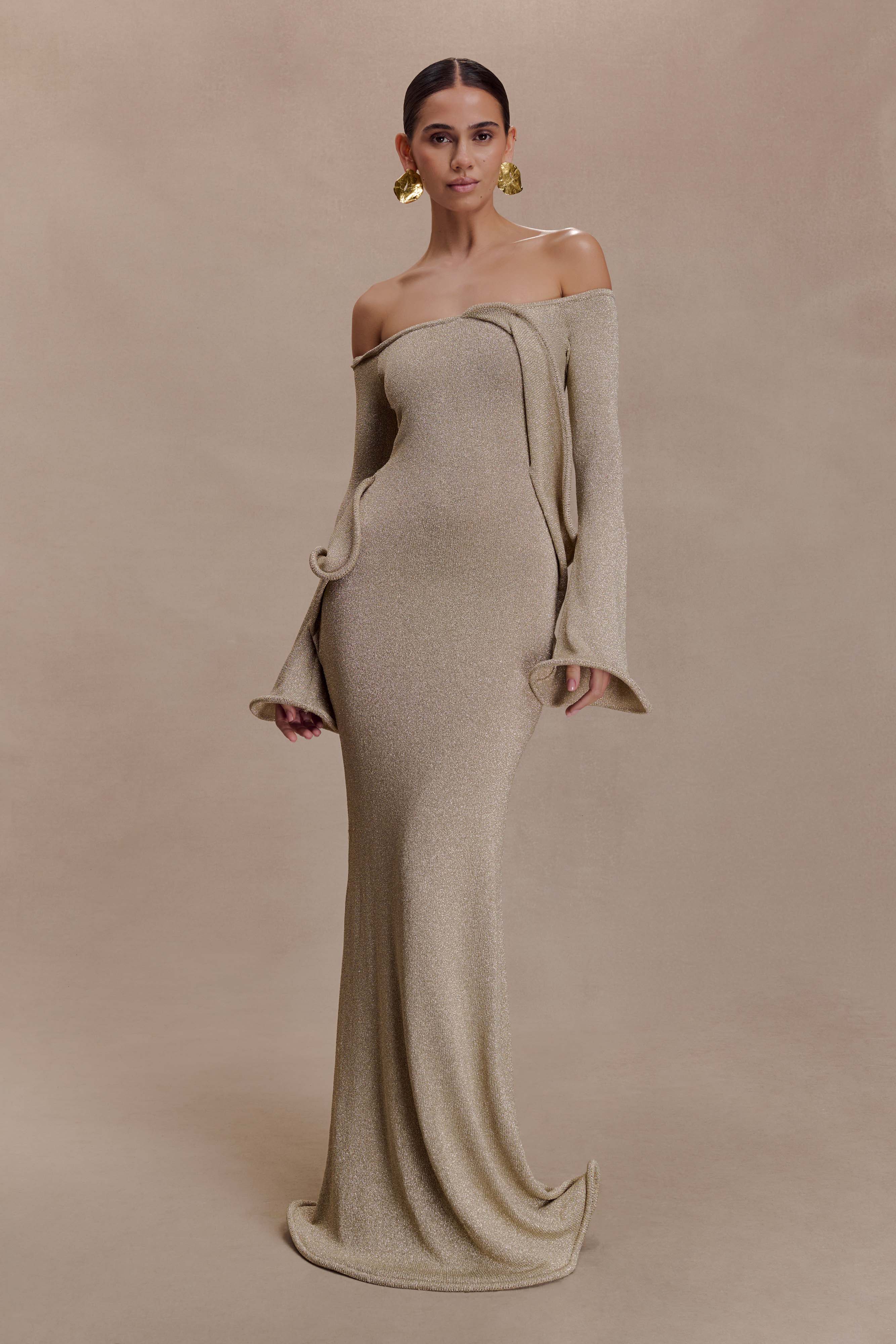 The SANDRINE Lurex Knit Maxi Dress is a striking blend of romance and refinement. Designed with a Bardot neckline and long sleeves, this fitted silhouette features flared sleeve hems and delicate ripple panel detailing through the front. The fishtail hem and softly rippled finish create graceful movement, while the unlined knit fabrication hugs the body in all the right places. this dress is your go-to for elevated evenings, balancing softness with sculptural allure.