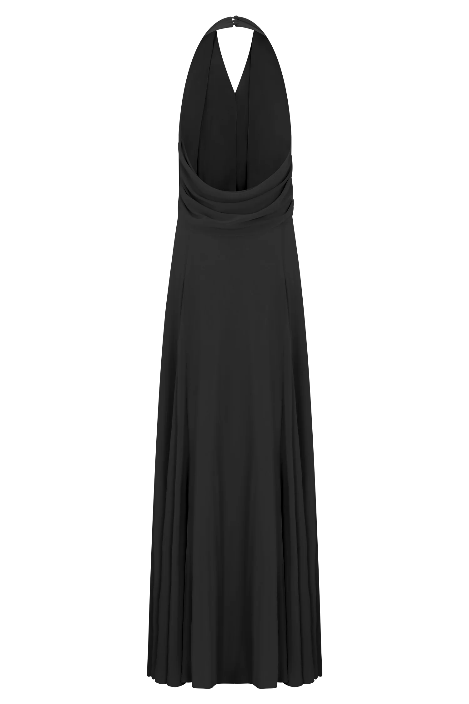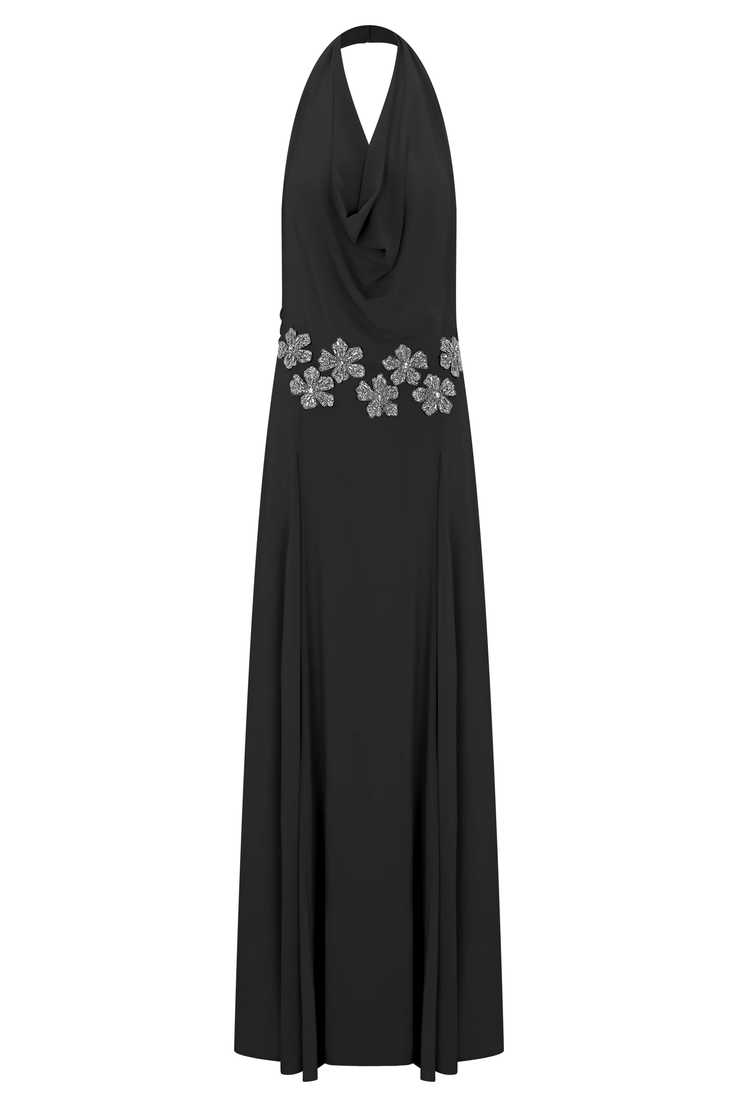 The SANTAL Floral Chiffon Halter Maxi Dress is an ethereal silhouette designed for movement and ease. Featuring a soft cowl neckline with a halter neck secured by three buttons, it drapes effortlessly across the body for a graceful finish. Diamante trims at the front waist add a touch of sparkle, while a detachable scarf at the neck offers versatile styling options. Fully lined for comfort and cut to a maxi length, this dress embodies timeless femininity with a modern edge.