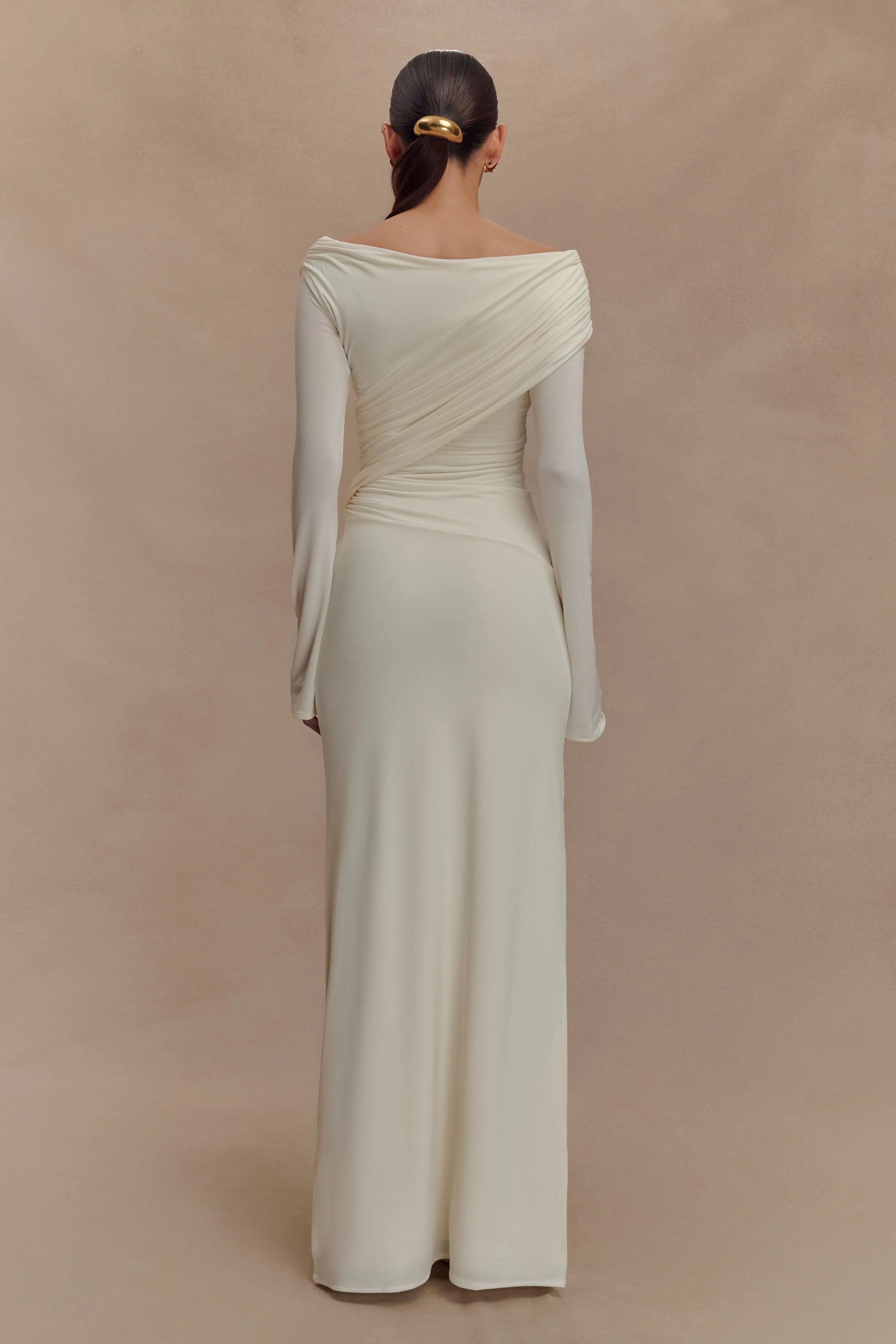 The THERESE Off Shoulder Ruched Maxi Dress is a refined take on modern glamour. Designed with a flattering off-shoulder neckline and long sleeves, this fully lined maxi dress hugs the body with a sleek, fitted silhouette. Delicate ruched detailing along the shoulders adds texture and softness, creating a look that’s both romantic and confident. Perfect for evening occasions, formal events, or celebrations that call for effortless sophistication.