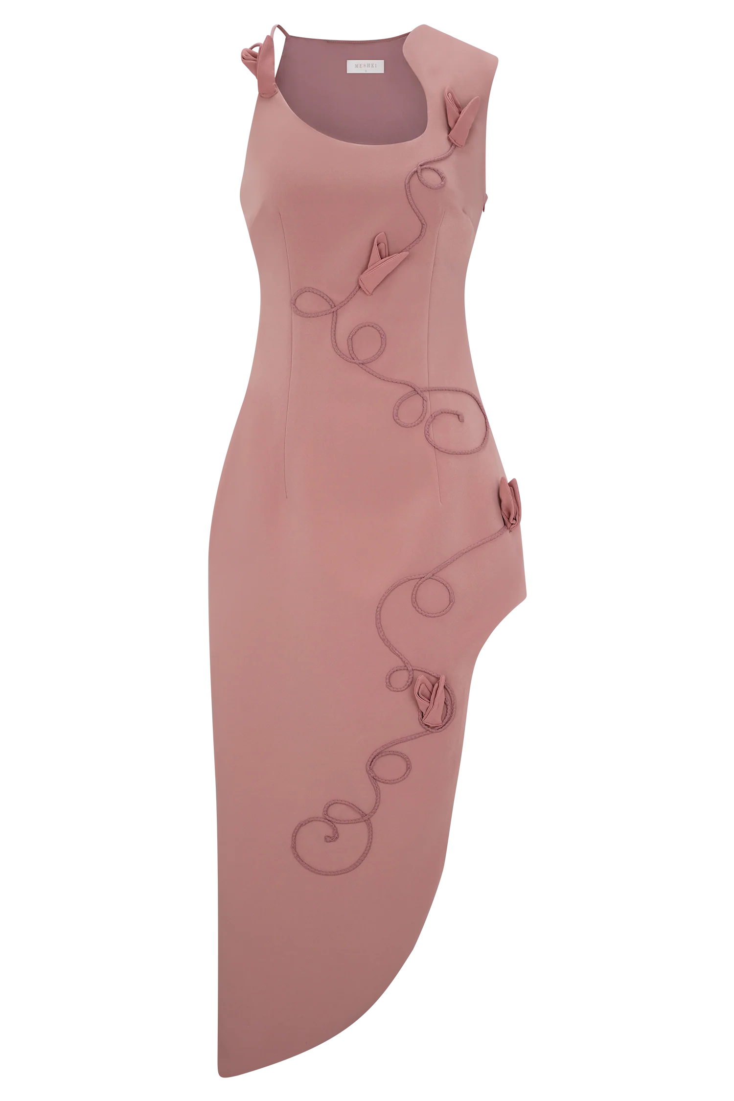 The VIRGINIA Suiting Embroidered Midi Dress blends strong structure with soft detailing for an effortlessly refined statement. Designed with an asymmetric neckline and hemline, this tailored silhouette features an intricate corded floral design that adds dimension and elegance. The midi length offers timeless appeal, while the invisible zip ensures a sleek finish. Fully lined for comfort, this dress is ideal for moments that call for modern sophistication with a romantic edge.
