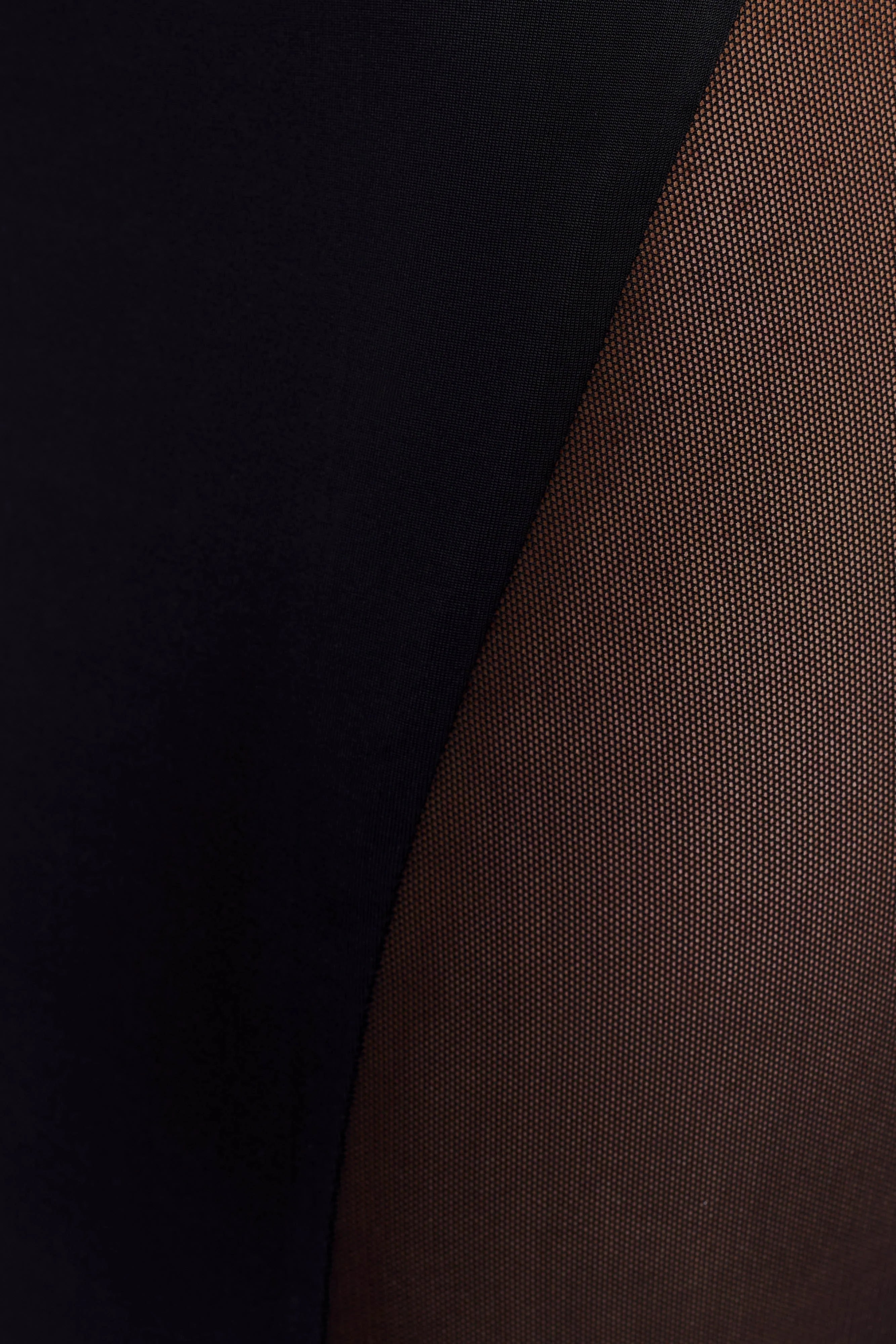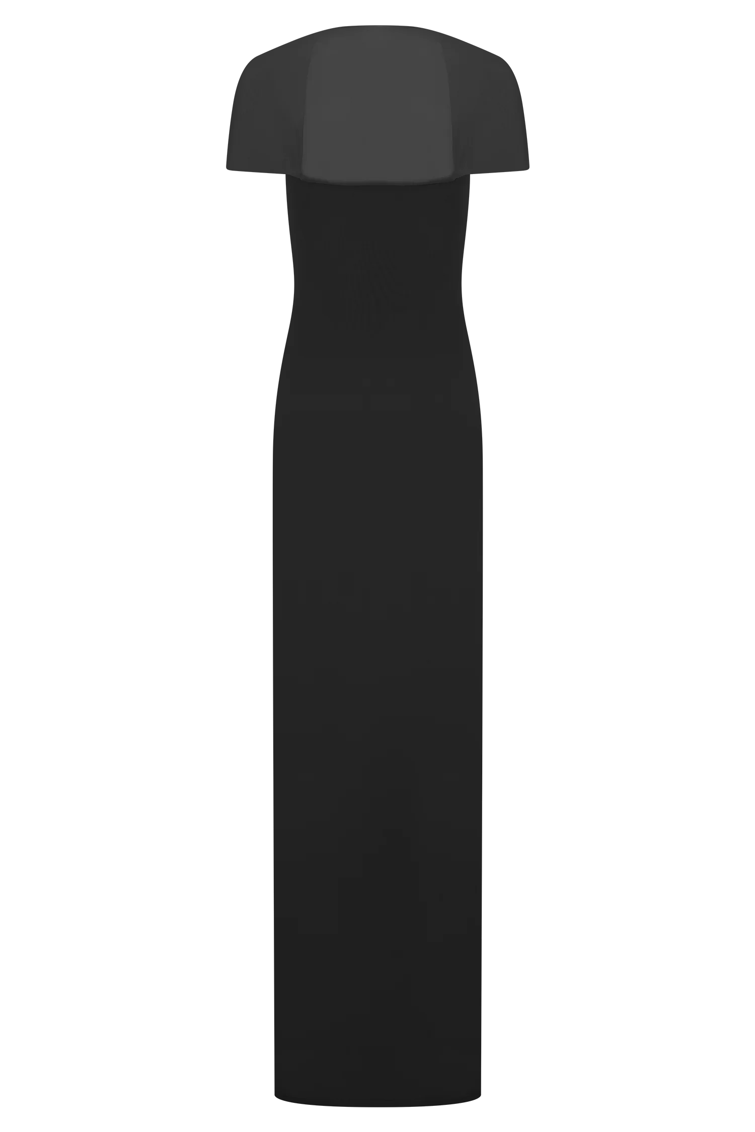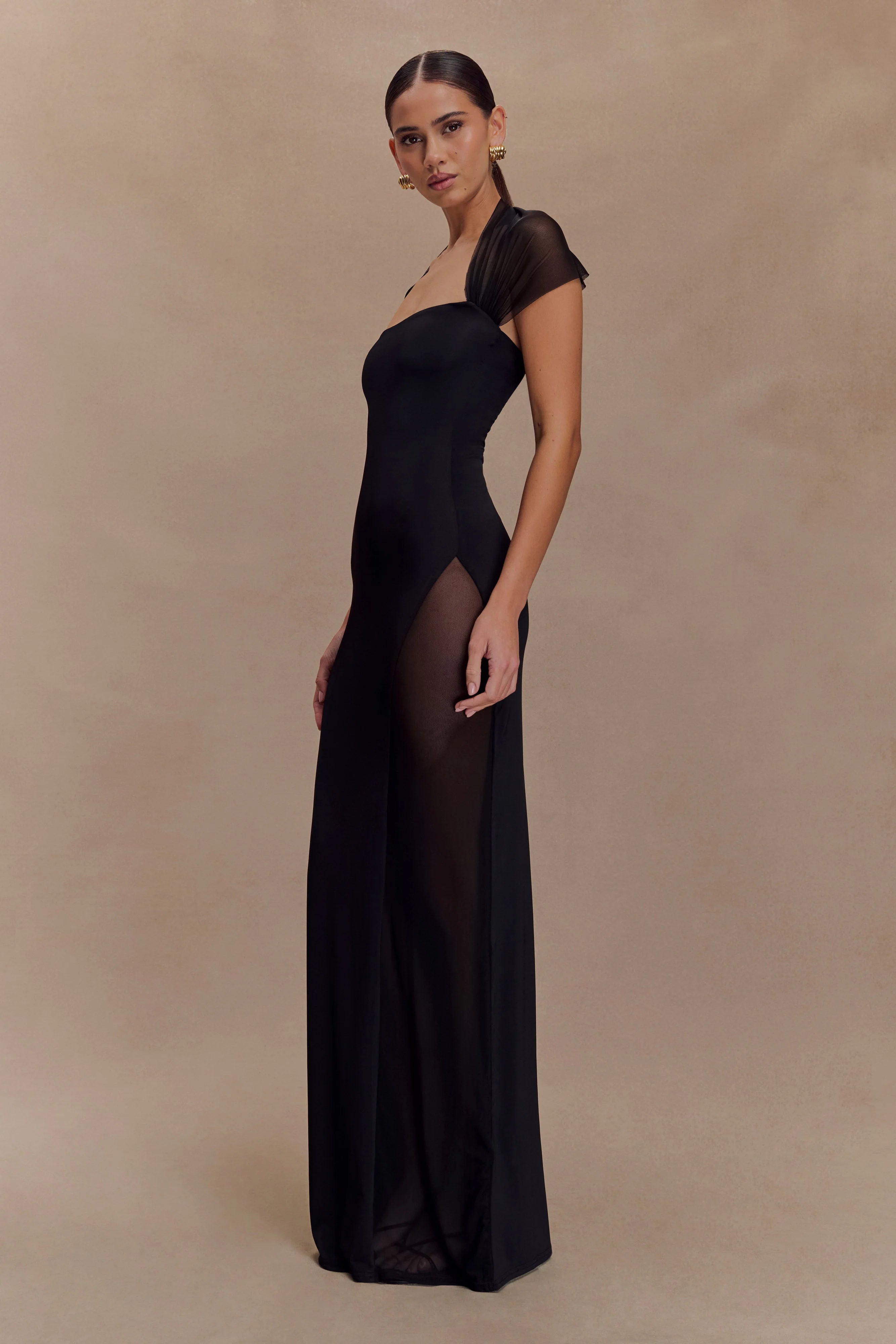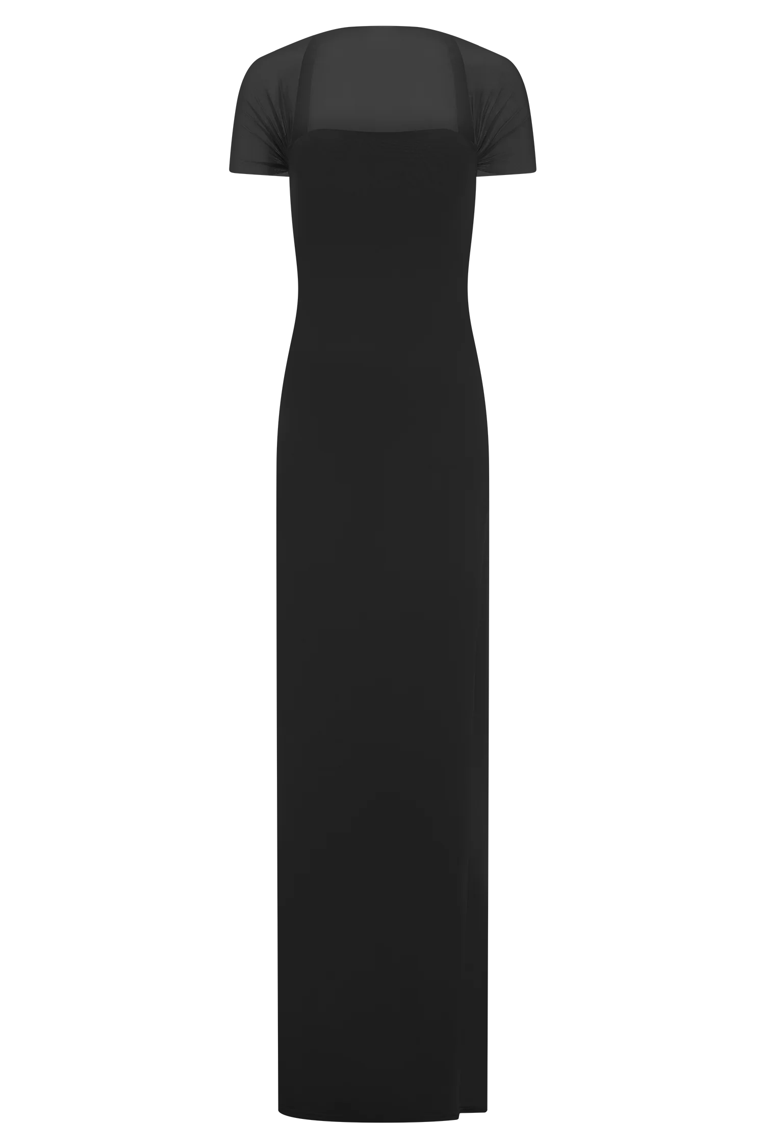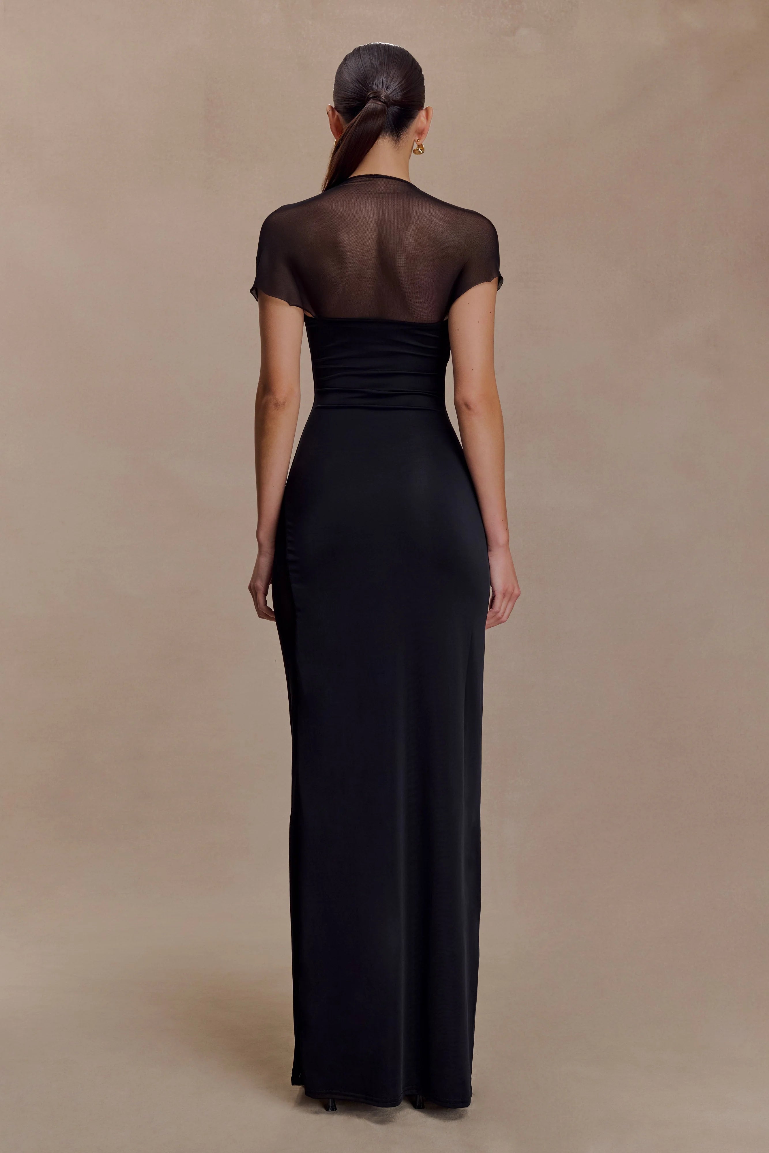 The WYATT Slinky And Mesh Maxi DressWyatt Slinky And Mesh Maxi Dress - Black is designed to command attention with minimal effort. Featuring a sleek straight neckline and a fixed mesh shawl that delicately drapes the shoulders, this silhouette creates a powerful balance between structure and softness. The fitted design hugs your curves, while the side leg split and mesh overlay add fluid movement and visual intrigue. Fully lined for comfort, this dress is the definition of evening sophistication—elevated and unforgettable.